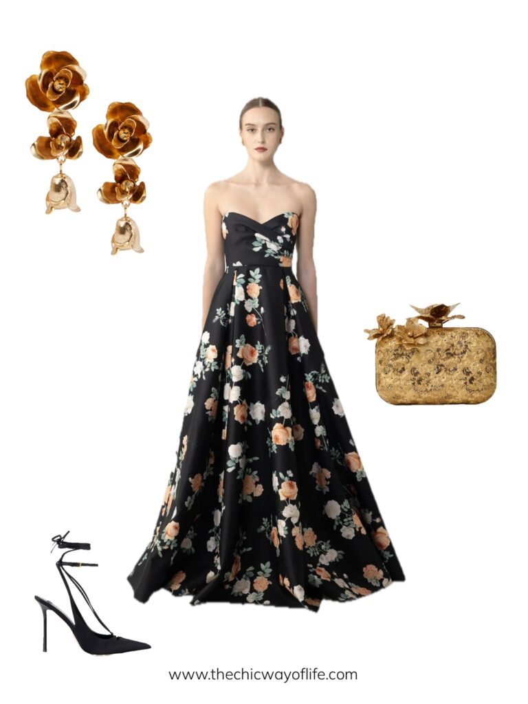 Look 2: Black floral dress + pointed-toe pumps + drop down earrings + gold clutch