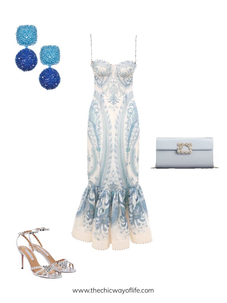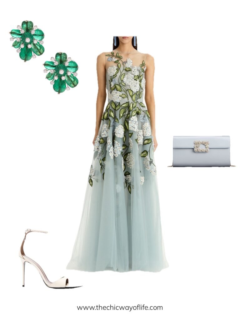How to style: Keep accessories elegant but impactful – chandelier earrings OR a statement necklace (not both!). Strappy heeled sandals or elegant pumps, a small evening clutch, and beautiful hair (updo or soft waves) complete the look.