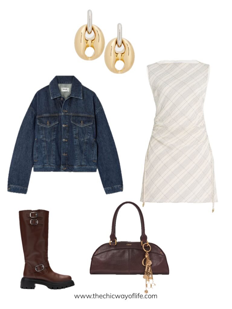 Look 1: tartan mini dress + denim jacket + moto boots + handbag with charms