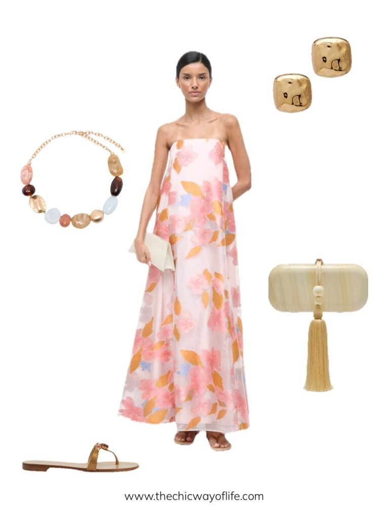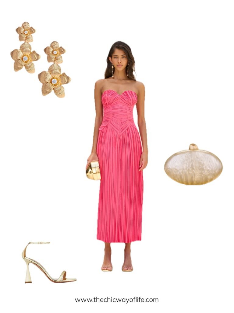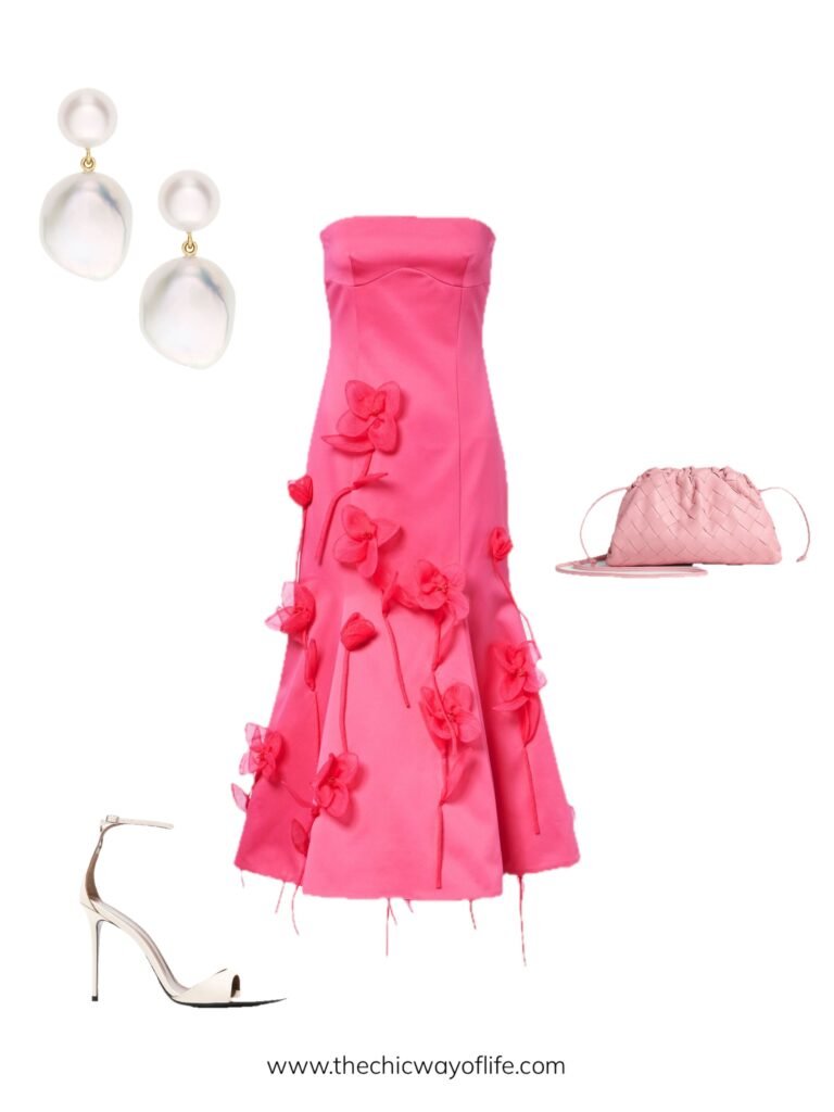 Look 1: Pink midi dress + strappy heeled sandals + flower earrings + structured clutch