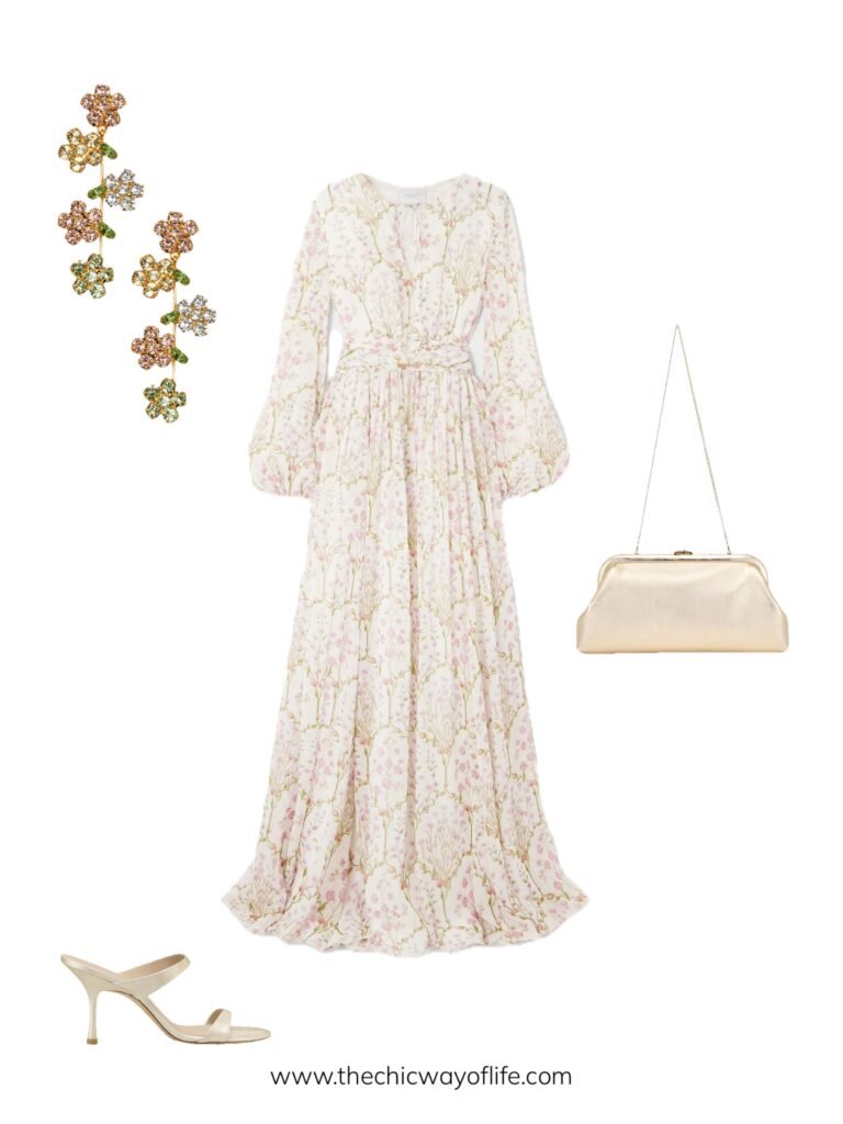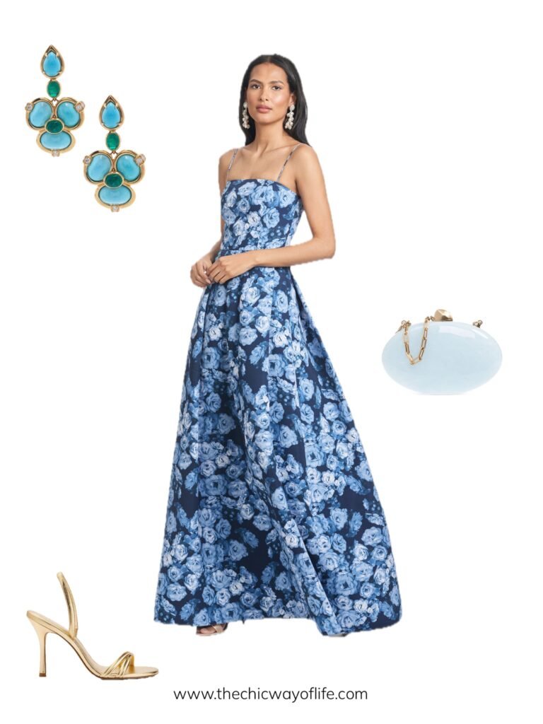 Look 3: Blue floral maxi dress + gold sandals + vintage-inspired earrings + structured clutch