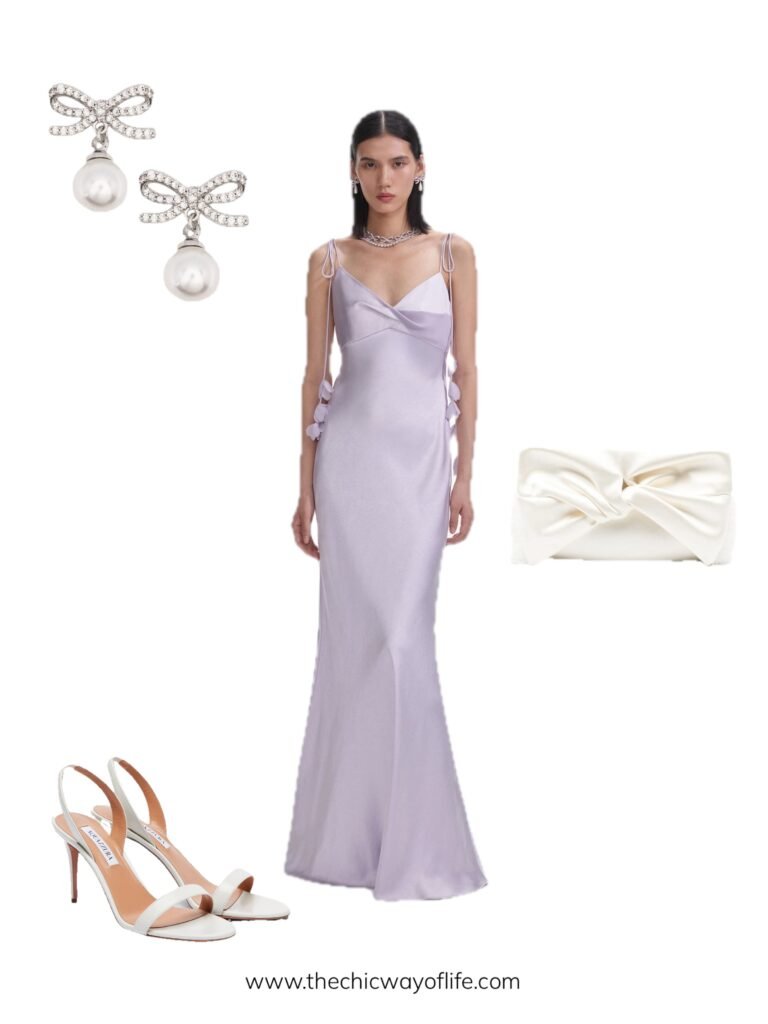 Look 2: Lavender satin wrap dress + heeled sandals + pearl earrings + clutch