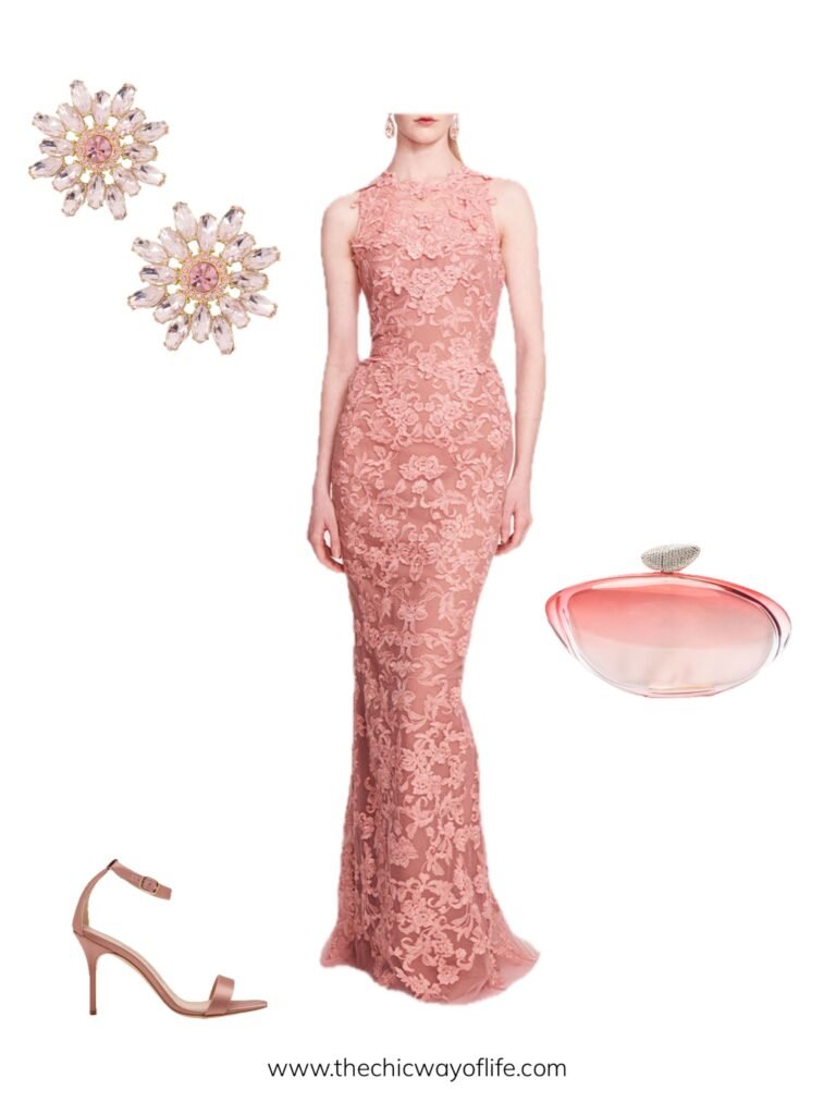 Look 3: Pink lace floor-length gown + heeled sandals + pink earrings + clutch