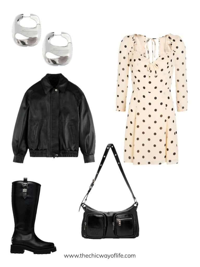 Look 2: Polka dots mini dress + leather jacket + boots + silk scarf in hair + pocket bag