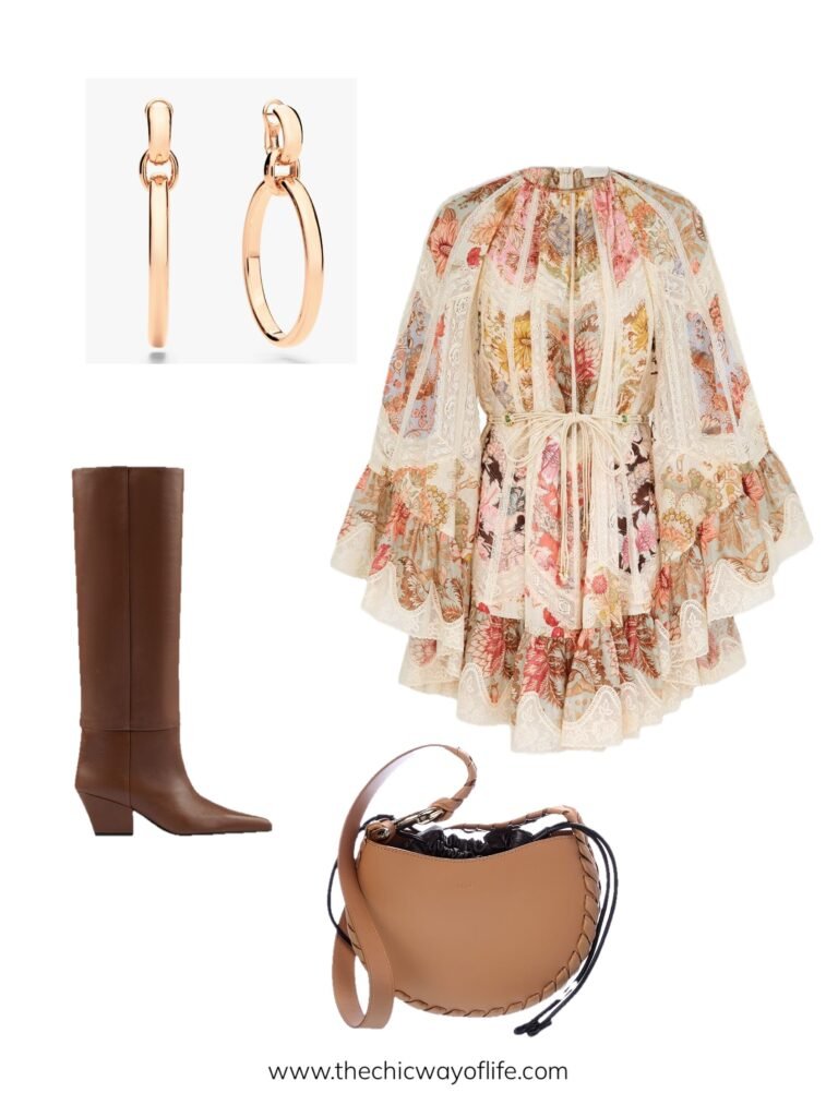 Look 3: Boho cotton dress + cowboy boots + mini hobo bag + gold hoops