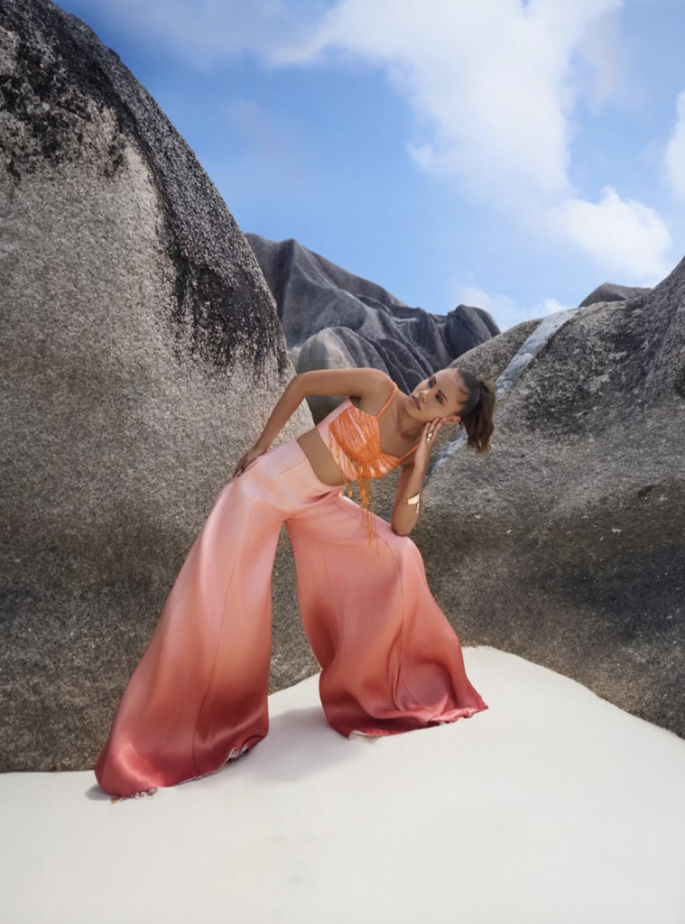 Vibe: Bold luxury, sculptural design, statement resort wear