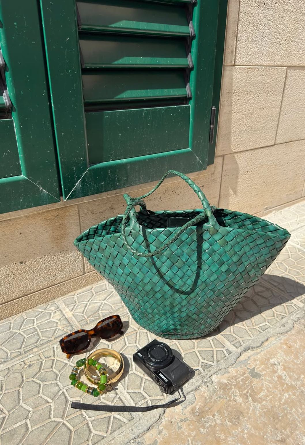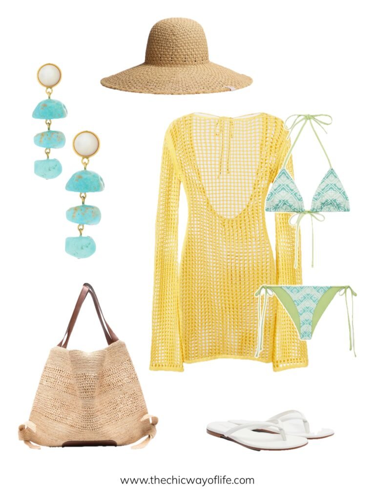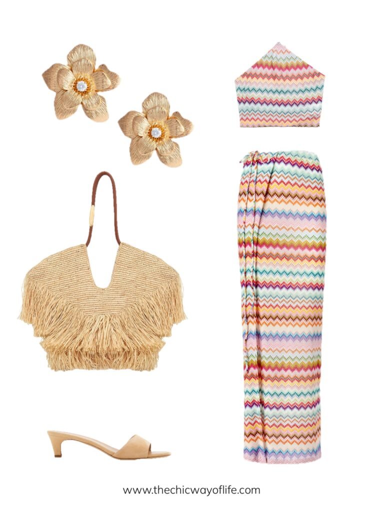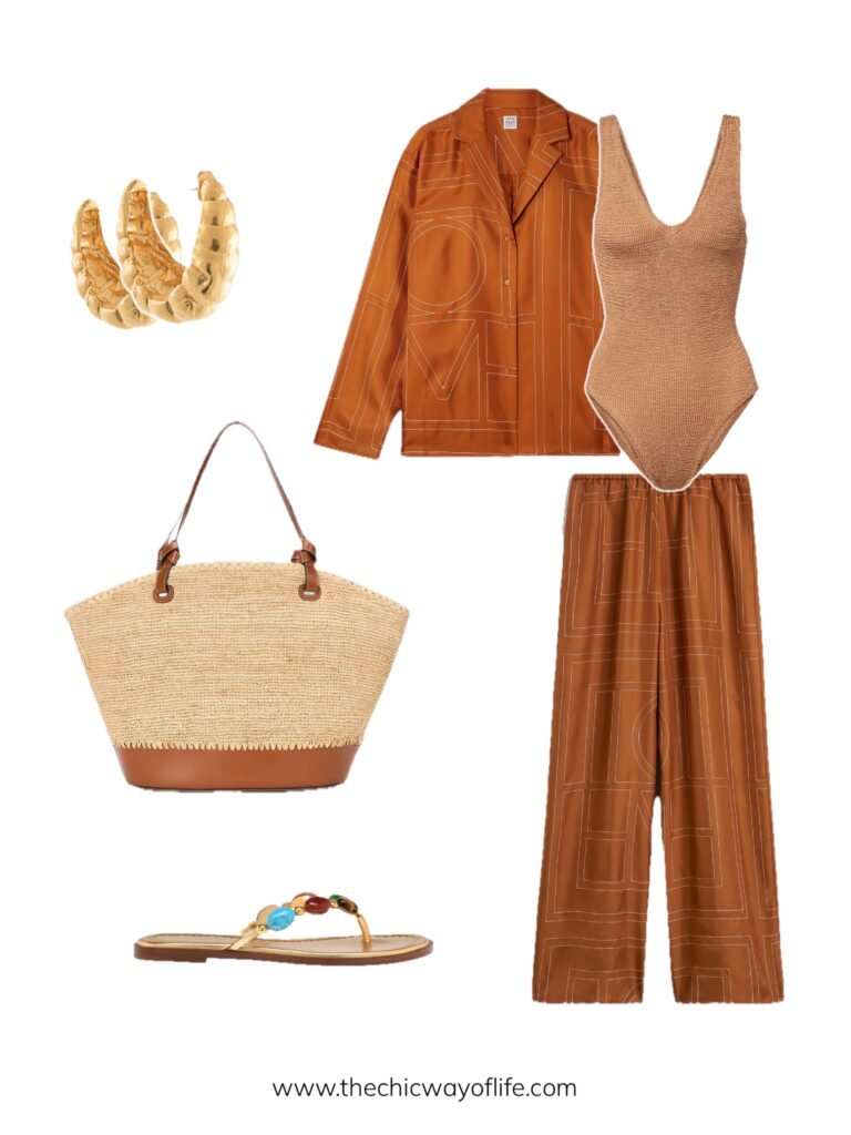 Wear a matching printed linen or cotton set (shirt and trousers) over your swimsuit, add flat sandals and tote. The coordinated set looks intentional and chic while being super practical for beach days!