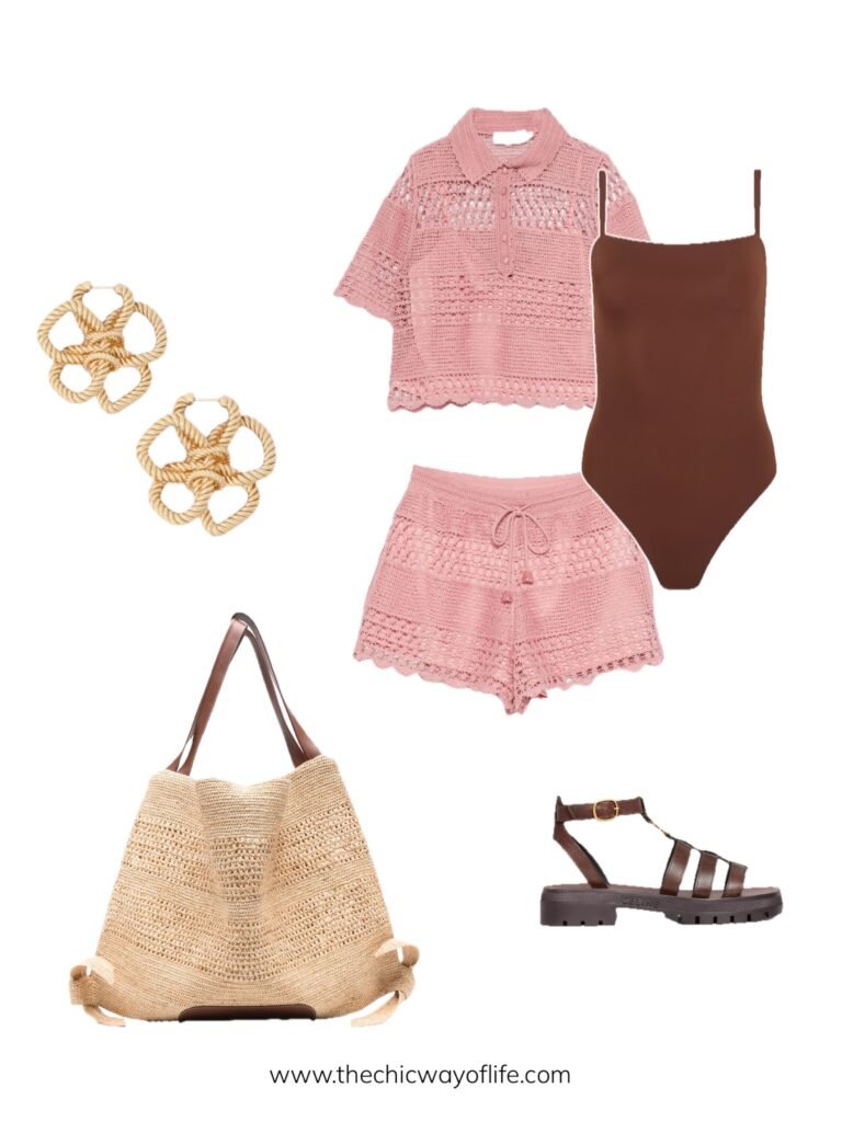 Create a beachy-chic look with a crochet set featuring shorts, bralette, and matching cardigan. Add flat sandals and a tote bag. This works perfectly for beach town exploring or casual coastal lunches!