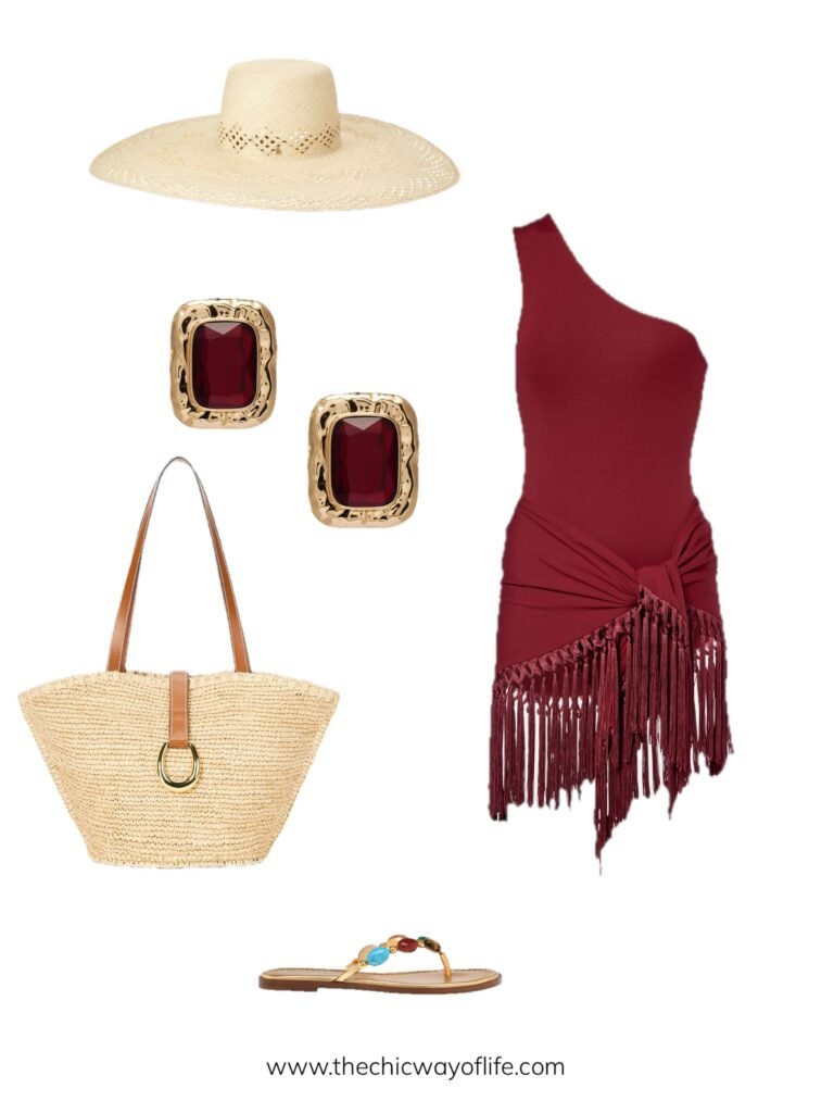Style your one-piece swimsuit with a fun fringed sarong, add flat sandals and tote. The fringe detail adds movement and a boho-chic vibe that’s perfect for beach days and pool parties!