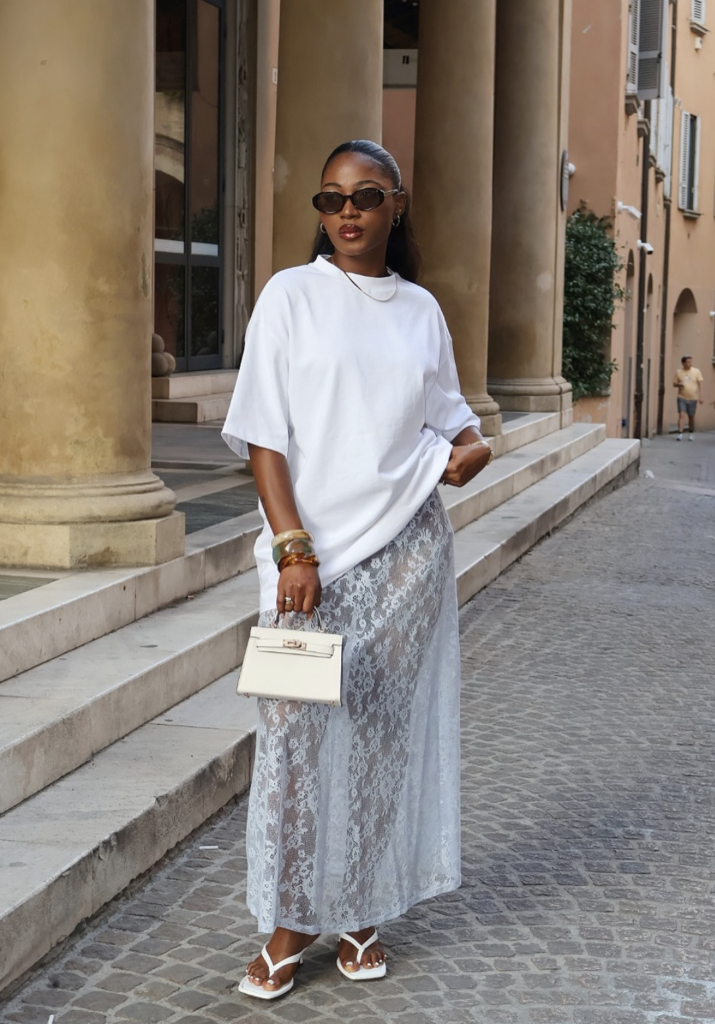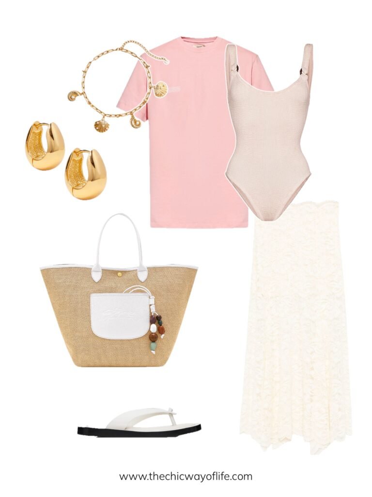 Layer a colorful or printed oversized tee over a delicate lace skirt (worn over your swimsuit), add flat sandals and tote. This unexpected combination is playful and feminine – perfect for beach club vibes!