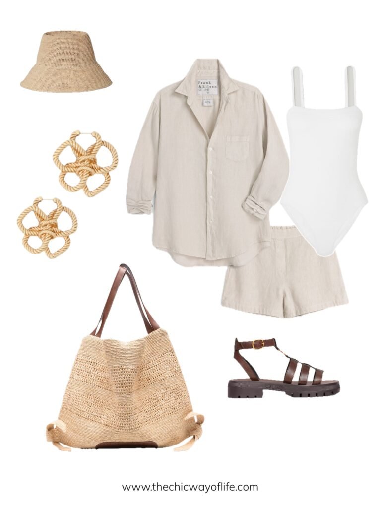 Style a matching linen shorts and shirt set over your one-piece swimsuit, add a cute bucket hat for sun protection, flat sandals, and your tote. This cohesive look is effortlessly chic for pool days!