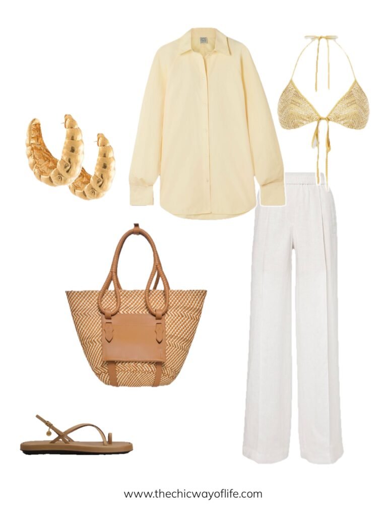 Layer a vibrant linen shirt over your bikini, pair with neutral trousers for coverage, add flat sandals and your tote. This breezy combination is perfect for beach-to-lunch transitions!