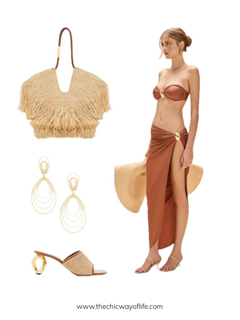 Pair your swimsuit with a coordinating long sarong, elevate with heeled sandals (hello, poolside glamour!), and carry your tote. This elegant combination works beautifully for upscale beach clubs!