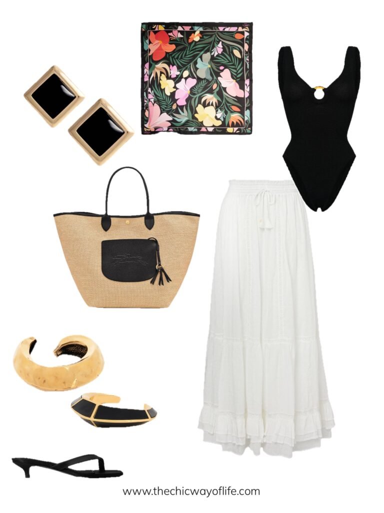 Style your one-piece swimsuit with a flowing white maxi skirt, add a colorful scarf, heeled mules for elevation, and your tote. This sophisticated beach look is perfect for sunset beach walks or beachside dinners!