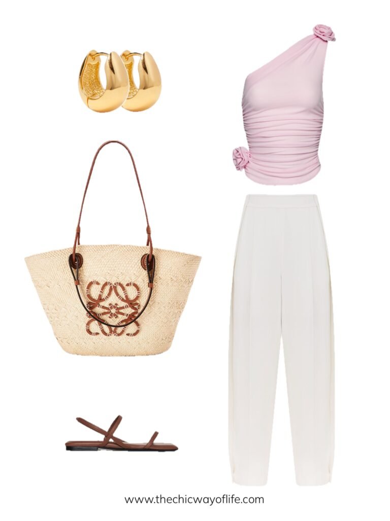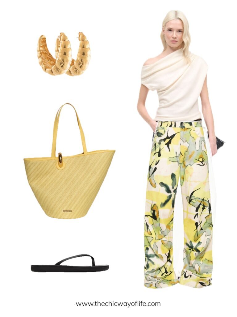 Style bold printed pants with a chic draped one-shoulder top and thong sandals. Add your tote bag for the perfect balance of statement-making and practical. This look works beautifully for upscale casual exploring or lunch dates!
