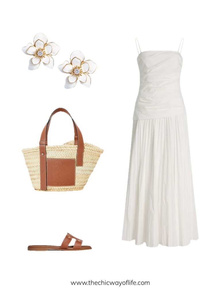 Wear a flowy midi dress with easy flat mule sandals and your tote bag. This effortlessly chic combination is comfortable, feminine, and appropriate for everything from brunch to casual dinners!