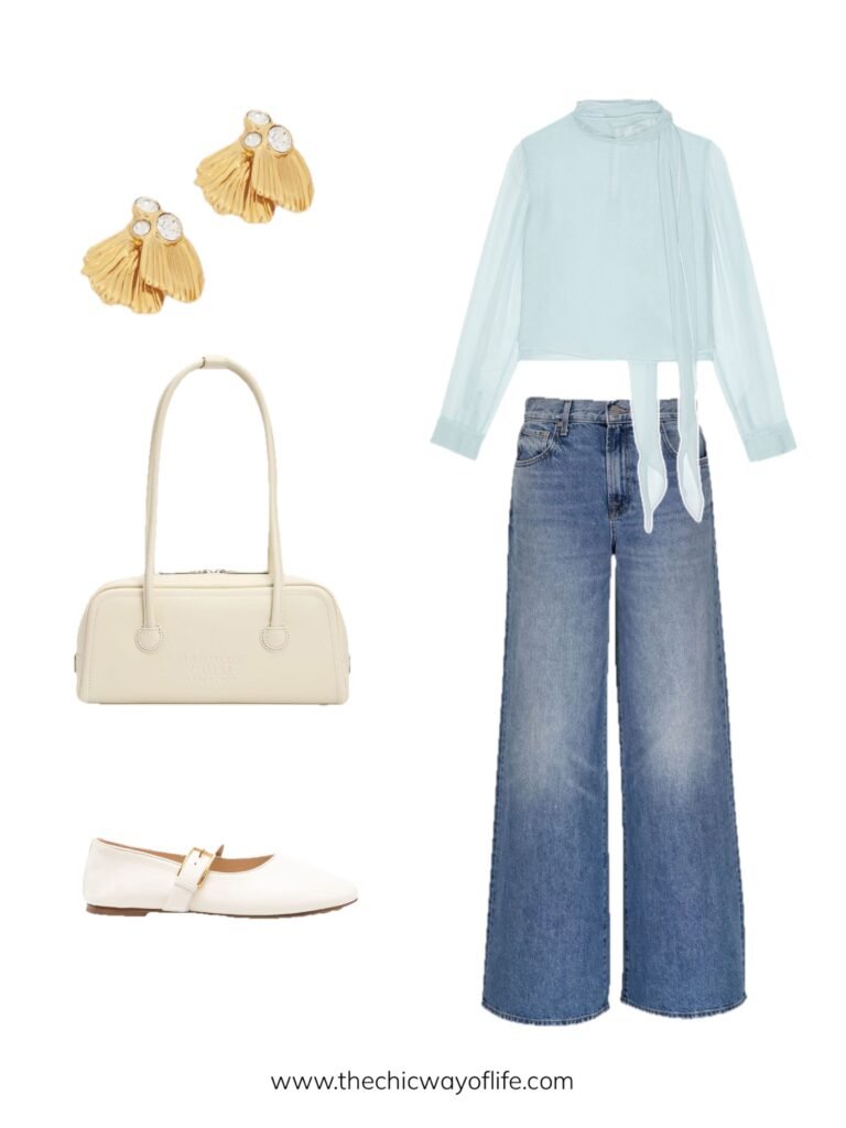 Pair a romantic blouse (ruffles, lace details, or pretty neckline) with wide-leg jeans, add ballet flats, and carry a shoulder bag. This polished casual look is perfect for city exploring or outdoor cafés!