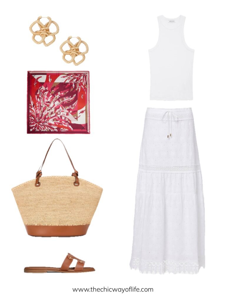 Style a simple tank top with a cotton maxi skirt, add flat mule sandals, tie a colorful scarf at your waist or in your hair, and carry your tote. The scarf adds that perfect pop of personality!
