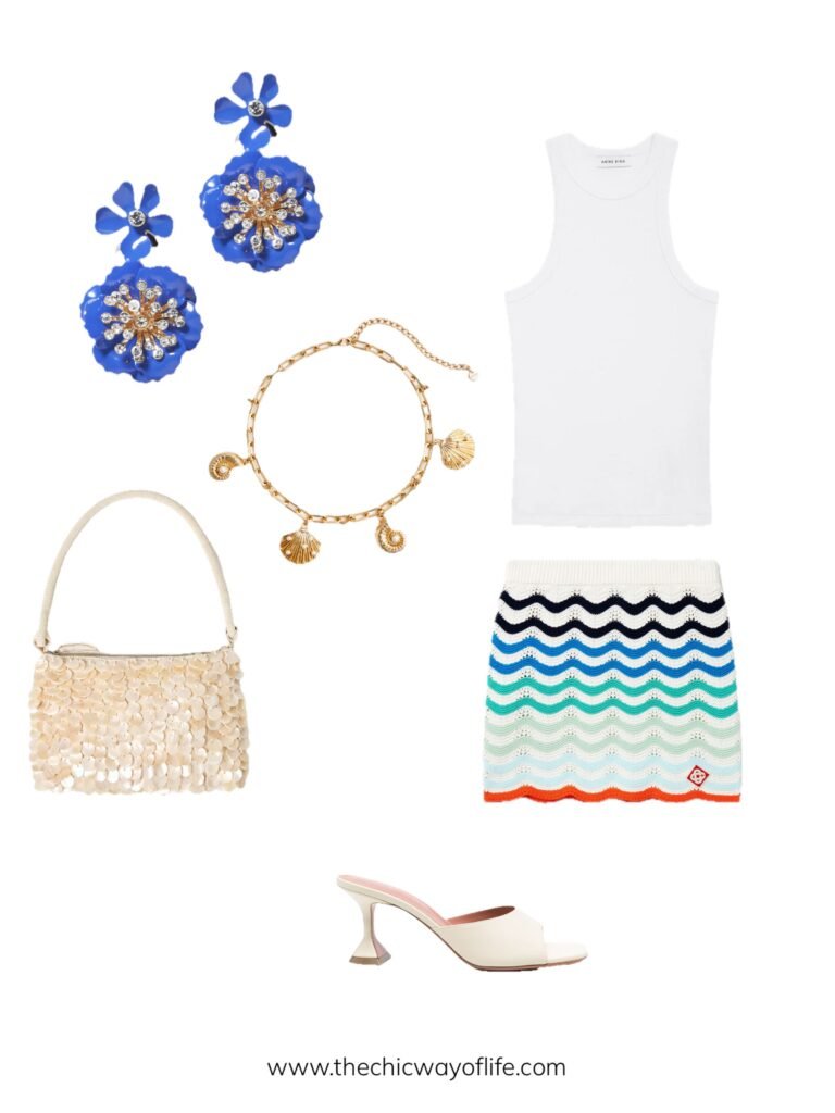 Pair a vibrant mini skirt with a simple white tank top, layer on statement earrings AND a statement necklace for impact, add heeled mules and shell bag. This fun combination is perfect for rooftop cocktails or lively dinner spots!