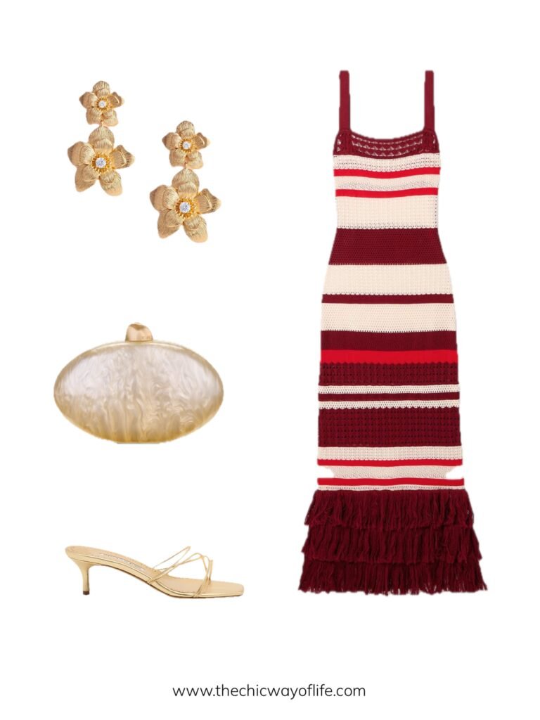 Wear an elegant maxi crochet dress with statement earrings, heeled mules, and clutch. The crochet texture adds interest while staying breezy for warm evenings – perfect for beachside restaurants or sunset cocktails!