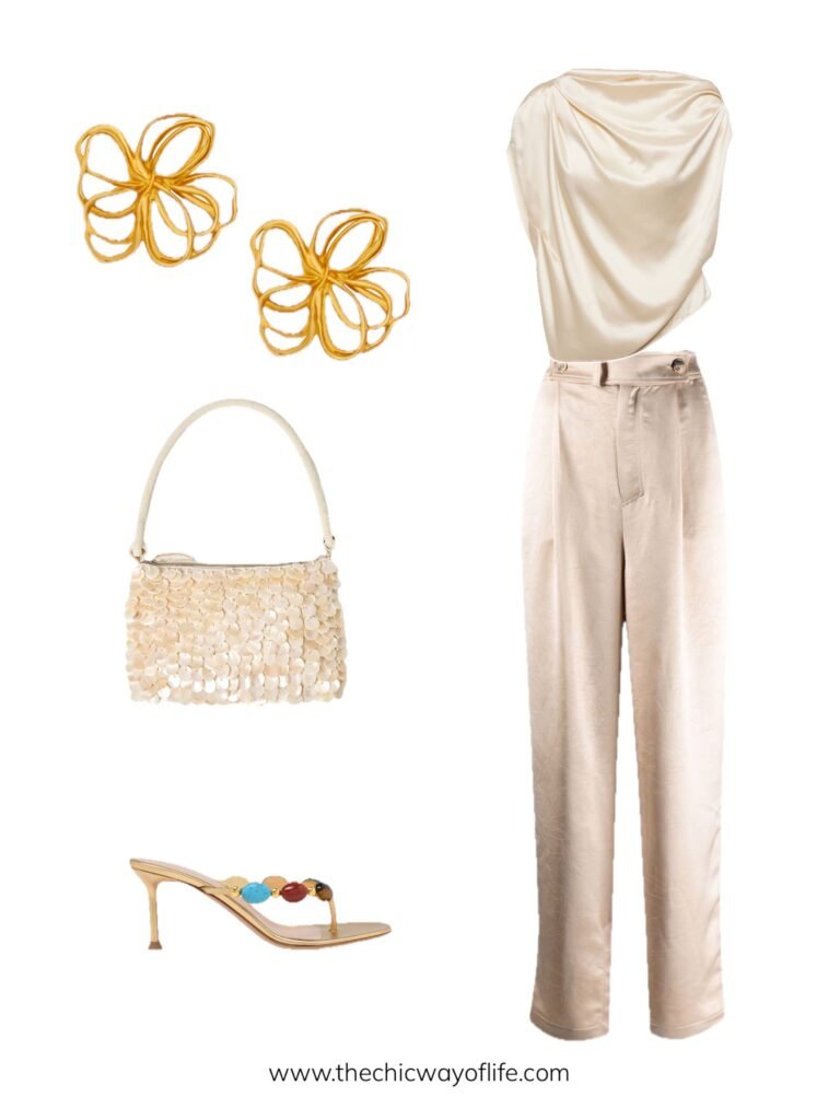 Create a polished evening look with a draped or asymmetric top paired with luxe satin trousers, statement earrings, heeled mules, and clutch. This combination is modern, sophisticated, and perfect for nicer restaurants!