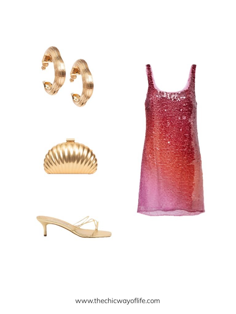 Make a statement in a sparkly mini sequin dress, add statement earrings (keep them simple to avoid competing with the dress), heeled mules, and clutch. Perfect for festive dinners or party nights!