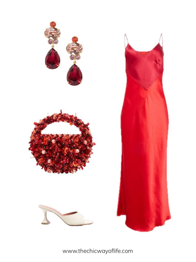 All looks include statement earrings, clutch or pouch, and heeled mules