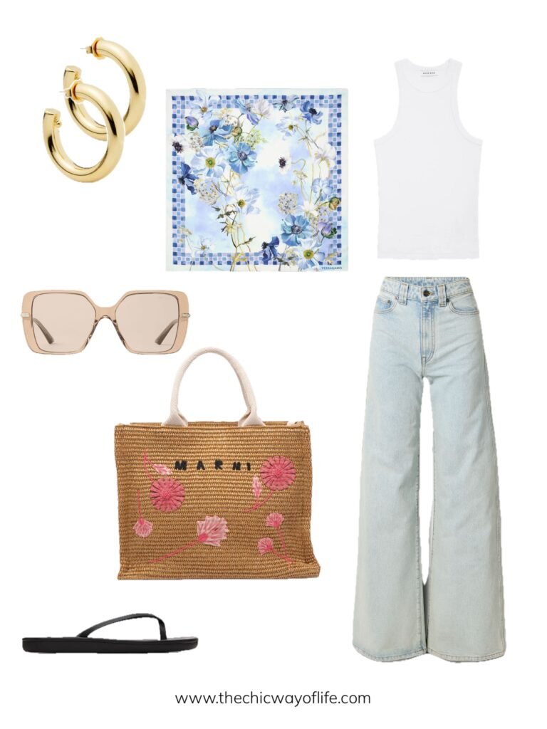 Keep it classic with a tank top and jeans, tie a silk scarf in your hair for that retro-glam touch, add thong sandals, and carry your tote. This timeless combination never fails for casual spring break days!