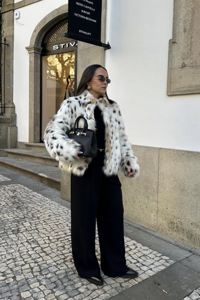 Your bag choice can make or break your faux fur coat outfit! Structured leather bags (totes, shoulder bags) create beautiful contrast with the soft texture of faux fur – perfect for daytime. Small clutches or mini bags work beautifully for evening looks, keeping things sleek. Crossbody bags are practical for casual wear and keep your hands free. Avoid bags with too much hardware or texture that compete with your coat!