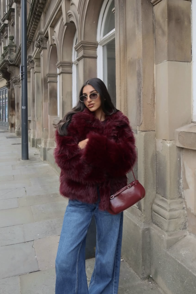 And can we talk about this season’s trends? We’re seeing everything from cropped faux fur jackets (so perfect for showing off your outfit underneath!) to oversized statement coats that give major drama. Colored faux fur is having a HUGE moment too – think rich burgundy, emerald green, chocolate brown, and even bold whites and creams. The texture mixing trend means you can pair your faux fur with literally everything from denim to leather to sparkly party pieces!
