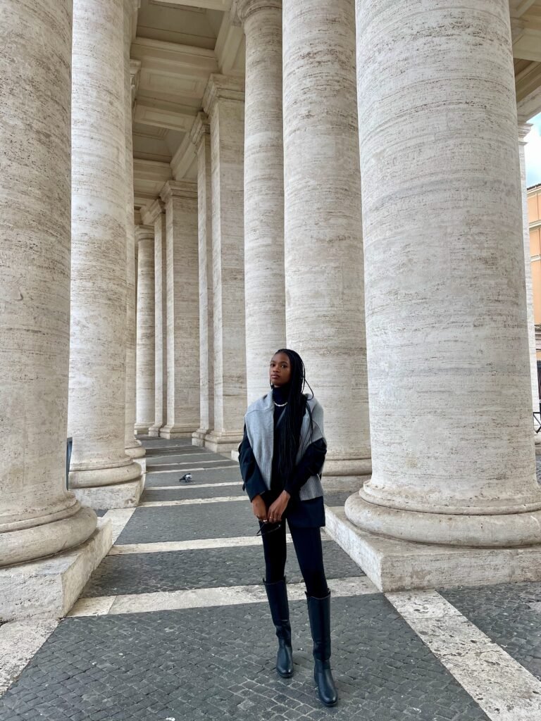What to Wear: Comfort is KEY for all that walking! Black leggings (thick, not see-through!), a cozy oversized knit sweater, and an oversized blazer create a chic, covered look perfect for Vatican dress code. Wear comfortable equestrian boots or sleek sneakers – you’ll be walking for hours! Bring an additional light knit or cardigan for layering (Vatican can be chilly inside). Crossbody bag for security. Remember: shoulders and knees covered!