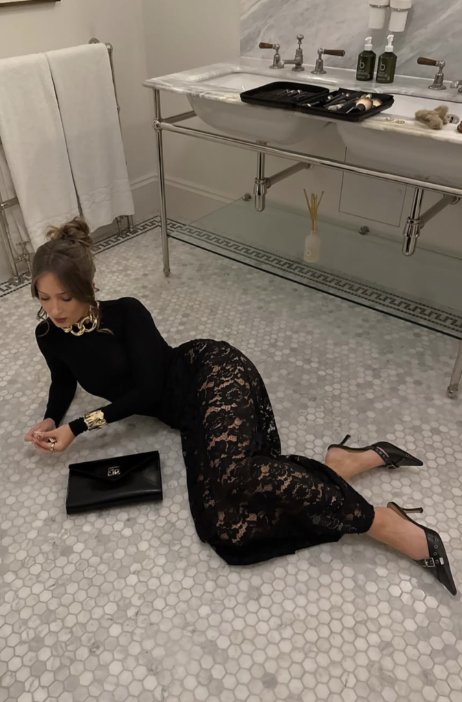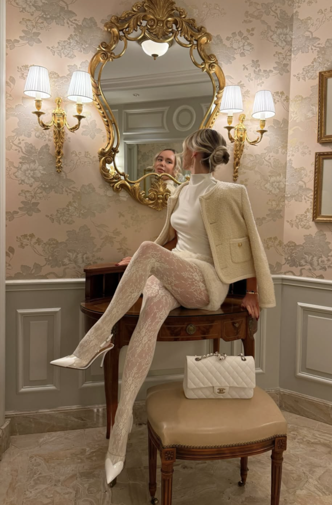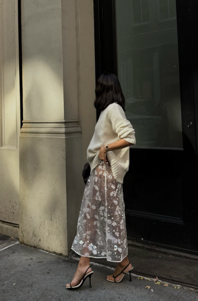 The Look: Pair a lace midi or mini skirt with a fitted turtleneck, silk camisole, or delicate knit top. Add tights if needed, heeled boots or slingbacks, a tailored coat or blazer, and carry a small shoulder bag. Keep jewelry romantic – pearls or delicate gold pieces work beautifully.