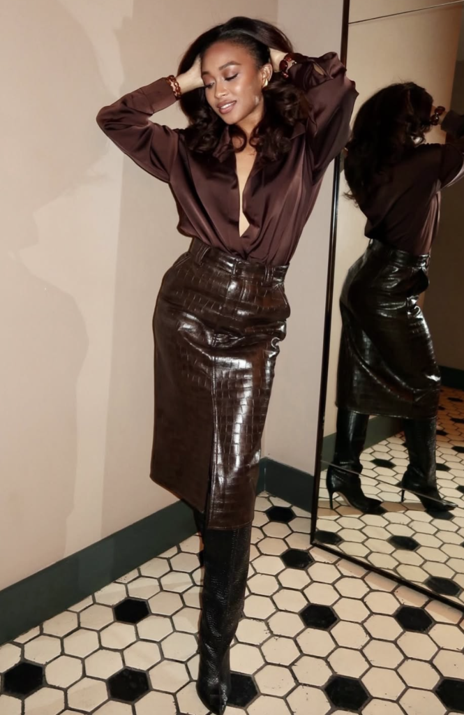 The Look: Style a satin, silk, or knit midi skirt with an elegant top – think fitted turtleneck, satin blouse, or structured knit. Add knee-high boots or heeled ankle boots, layer a wool coat or long blazer, and carry a shoulder bag or tote. Gold jewelry adds the perfect finishing touch.
