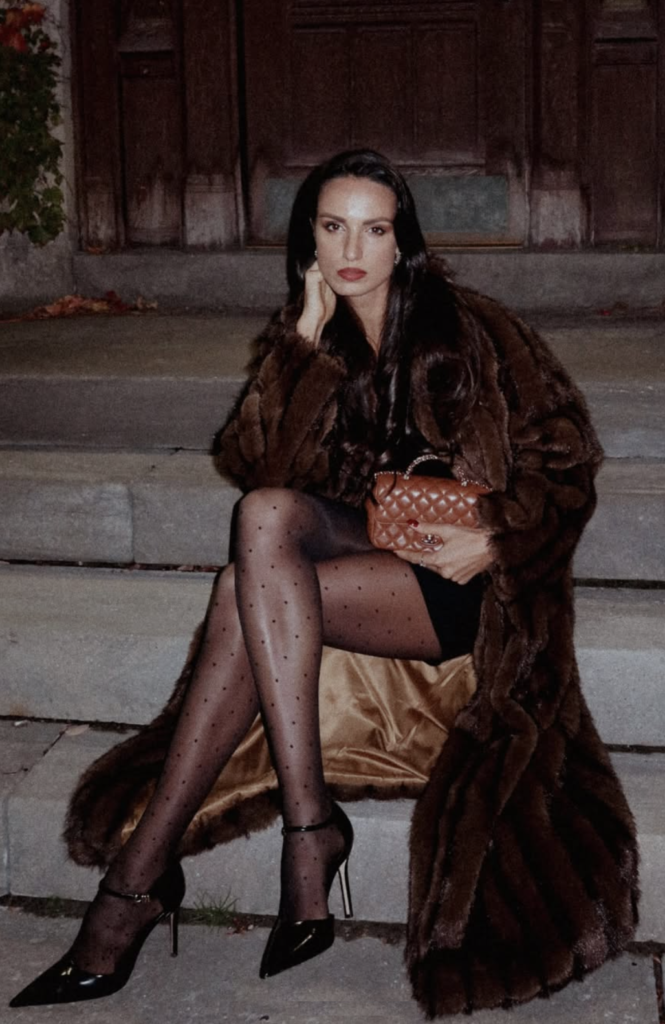 The Look: Style a mini skirt (leather, satin, or sequin) with a fitted top or bodysuit, then add a statement faux fur jacket or coat. Complete with tights, heeled boots or stilettos, bold jewelry, and a structured clutch or mini bag.