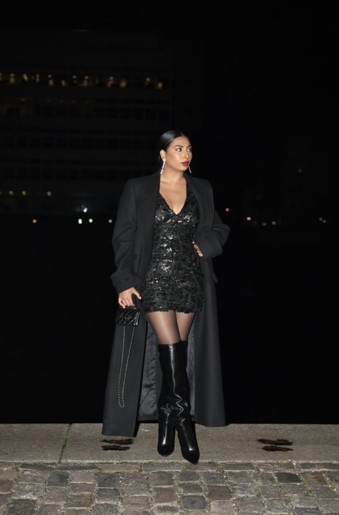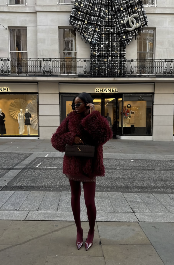 Why it works: This combination is playful and glamorous – perfect when your goal is to turn heads and have fun! The mini skirt shows off your legs, while the faux fur adds that luxe, celebratory vibe. It’s festive without being costume-y, and absolutely perfect for those special winter nights out!