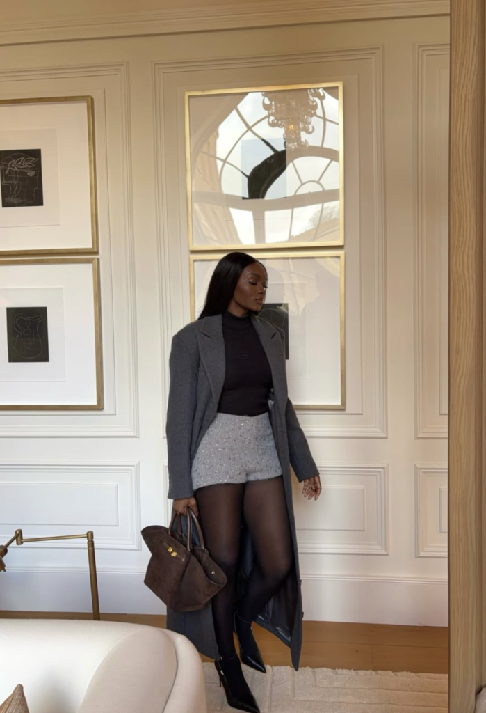 Why it works: This look is bold and modern – it shows you’re confident and fashion-forward! The shorts-with-tights combination is surprisingly warm and incredibly chic. It’s unexpected for winter, which makes it even more stylish. Perfect when you want to stand out and make an impression!